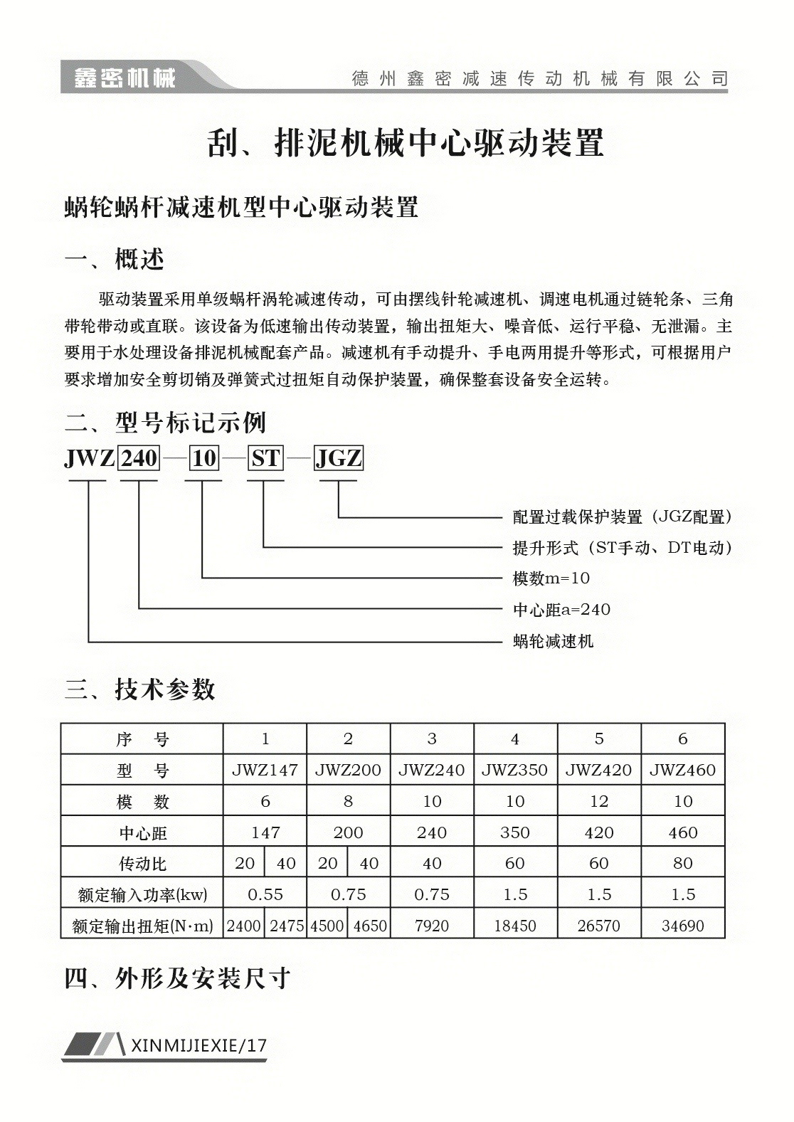 JWZ澄清池刮泥機專用蝸輪蝸桿減速機型號規格有JWZ147、JWZ200、JWZ240、JWZ350、JWZ420、JWZ460,JWZ672。根據澄清池大小選擇合適的蝸輪減速機。
